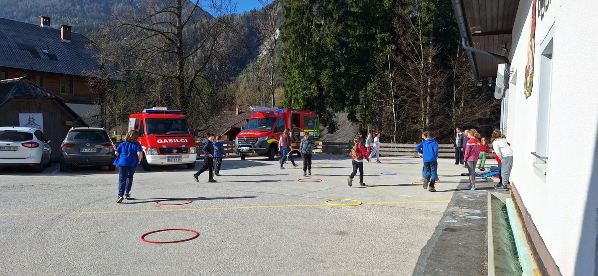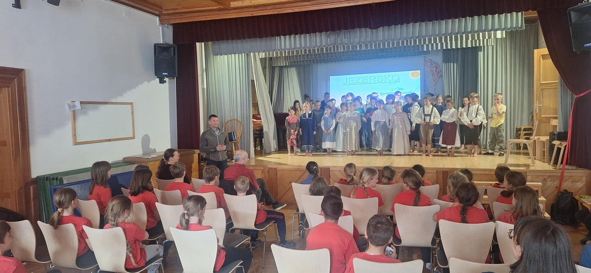 Takoj po prihodu smo jim privoščili nekaj gibalne sprostitve na športnem igrišču, kjer so se fantje takoj povezali v igri nogometa, bolj pogumna dekleta pa v klepetu. Po kosilu smo imeli predstavitev šol s kulturnim programom, zbrane sta pozdravila tudi župan Andrej Karničar in ravnatelj Jože Povšin. Popoldne smo se sprehodili do jezera in Jenkove kasarne, kjer sta nam gospe Olga in Mija predstavili zakladnico jezerske kulturne dediščine. Po povratku v »center« smo se še nekaj časa družili na igrišču, nato so jezerski šolarji odšli domov, gostje pa v gasilsko garažo na večerjo in potem v Korotan na njihov večerni program in spanje.