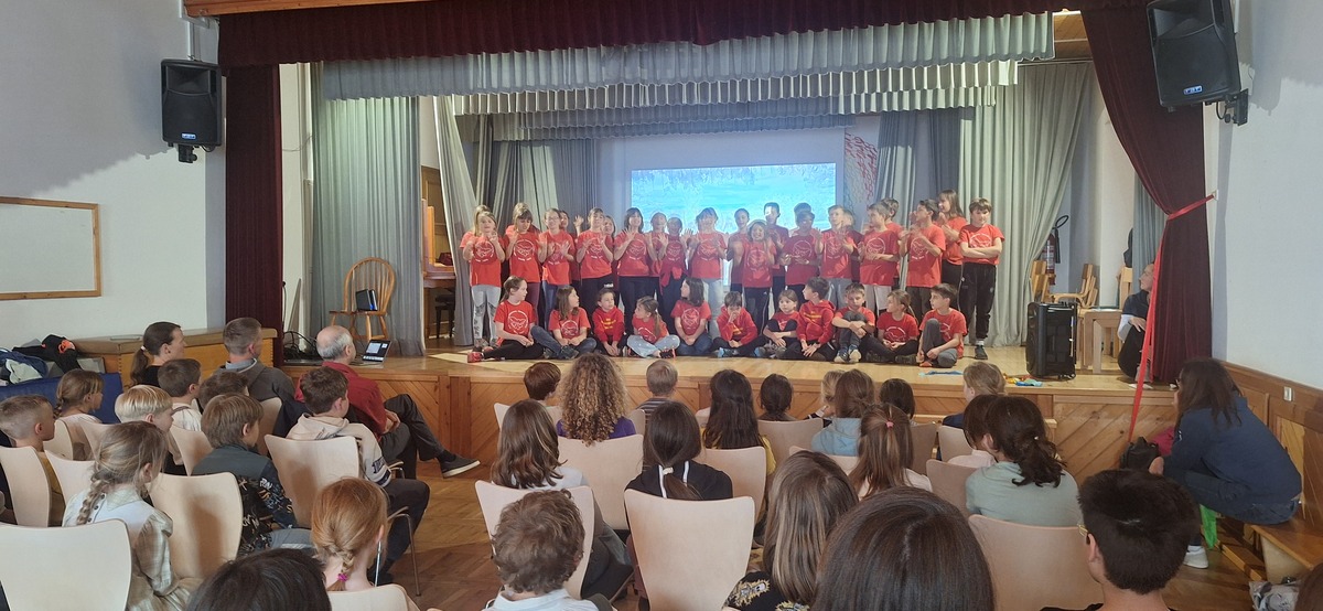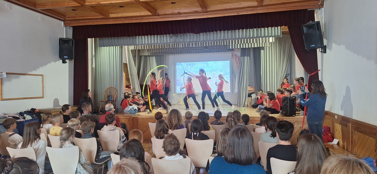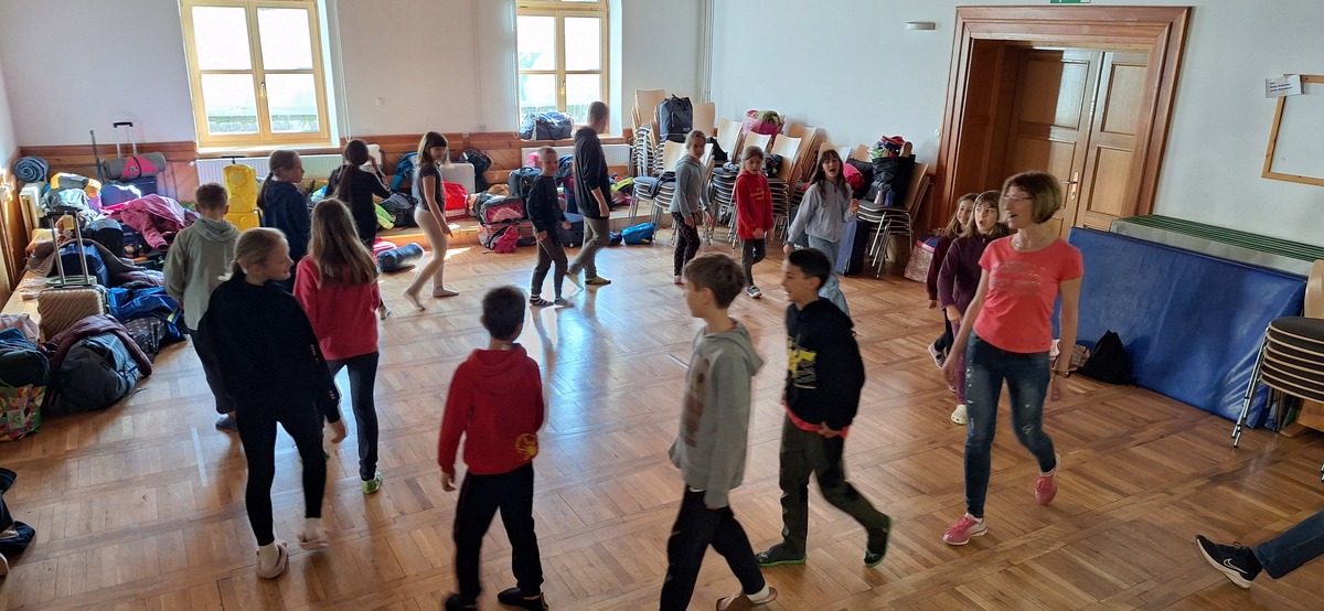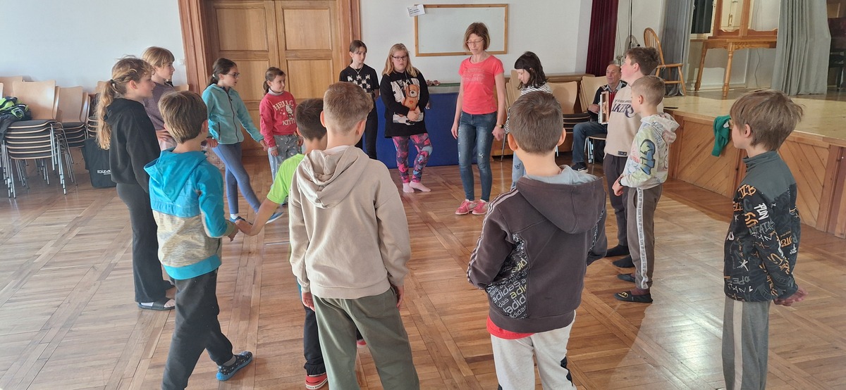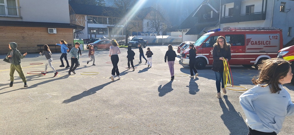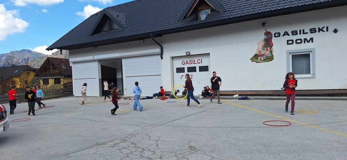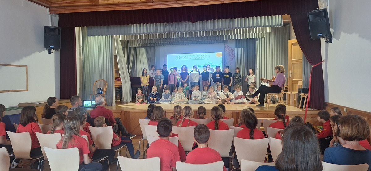 Takoj po prihodu smo jim privoščili nekaj gibalne sprostitve na športnem igrišču, kjer so se fantje takoj povezali v igri nogometa, bolj pogumna dekleta pa v klepetu. Po kosilu smo imeli predstavitev šol s kulturnim programom, zbrane sta pozdravila tudi župan Andrej Karničar in ravnatelj Jože Povšin. Popoldne smo se sprehodili do jezera in Jenkove kasarne, kjer sta nam gospe Olga in Mija predstavili zakladnico jezerske kulturne dediščine. Po povratku v »center« smo se še nekaj časa družili na igrišču, nato so jezerski šolarji odšli domov, gostje pa v gasilsko garažo na večerjo in potem v Korotan na njihov večerni program in spanje.
